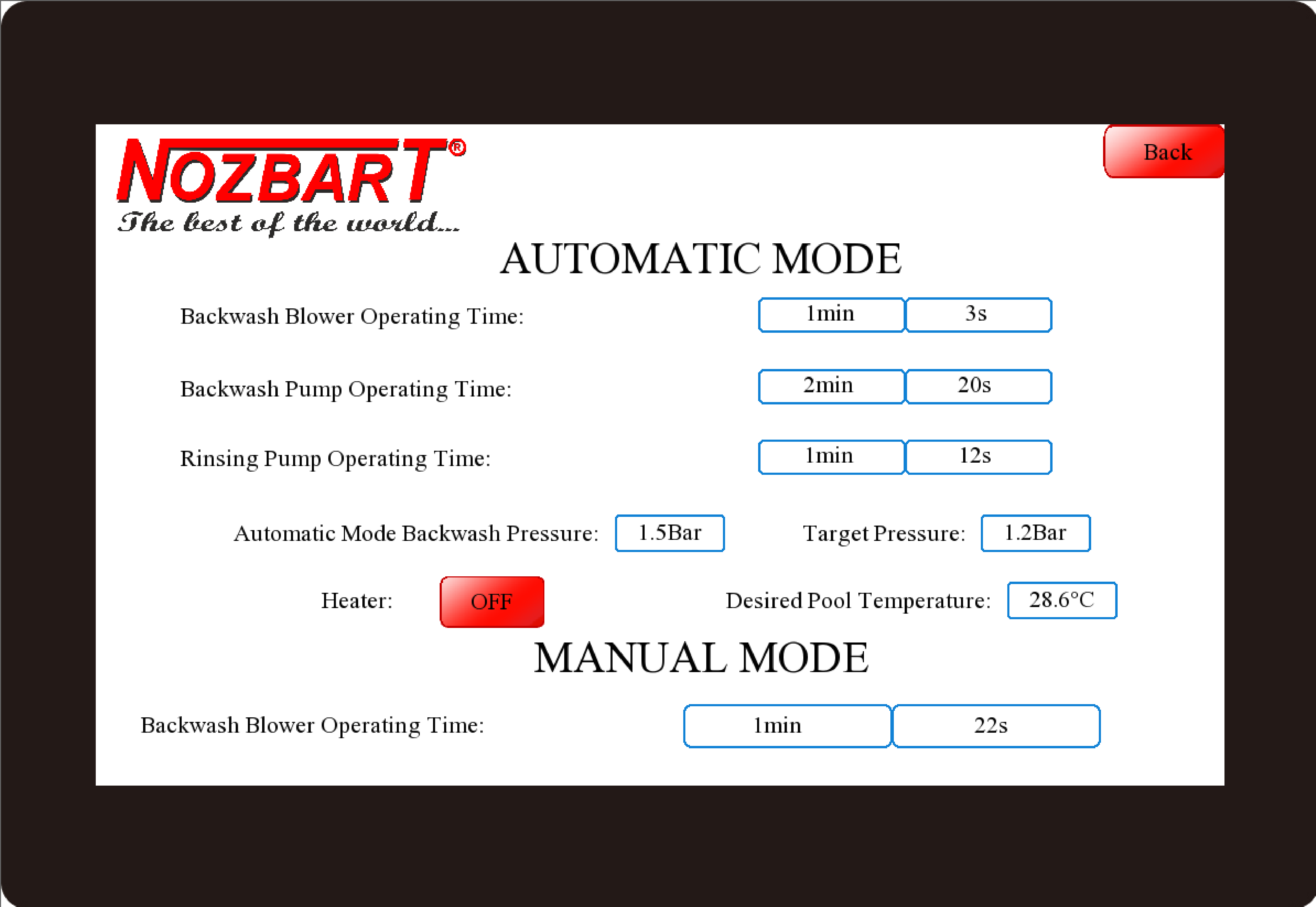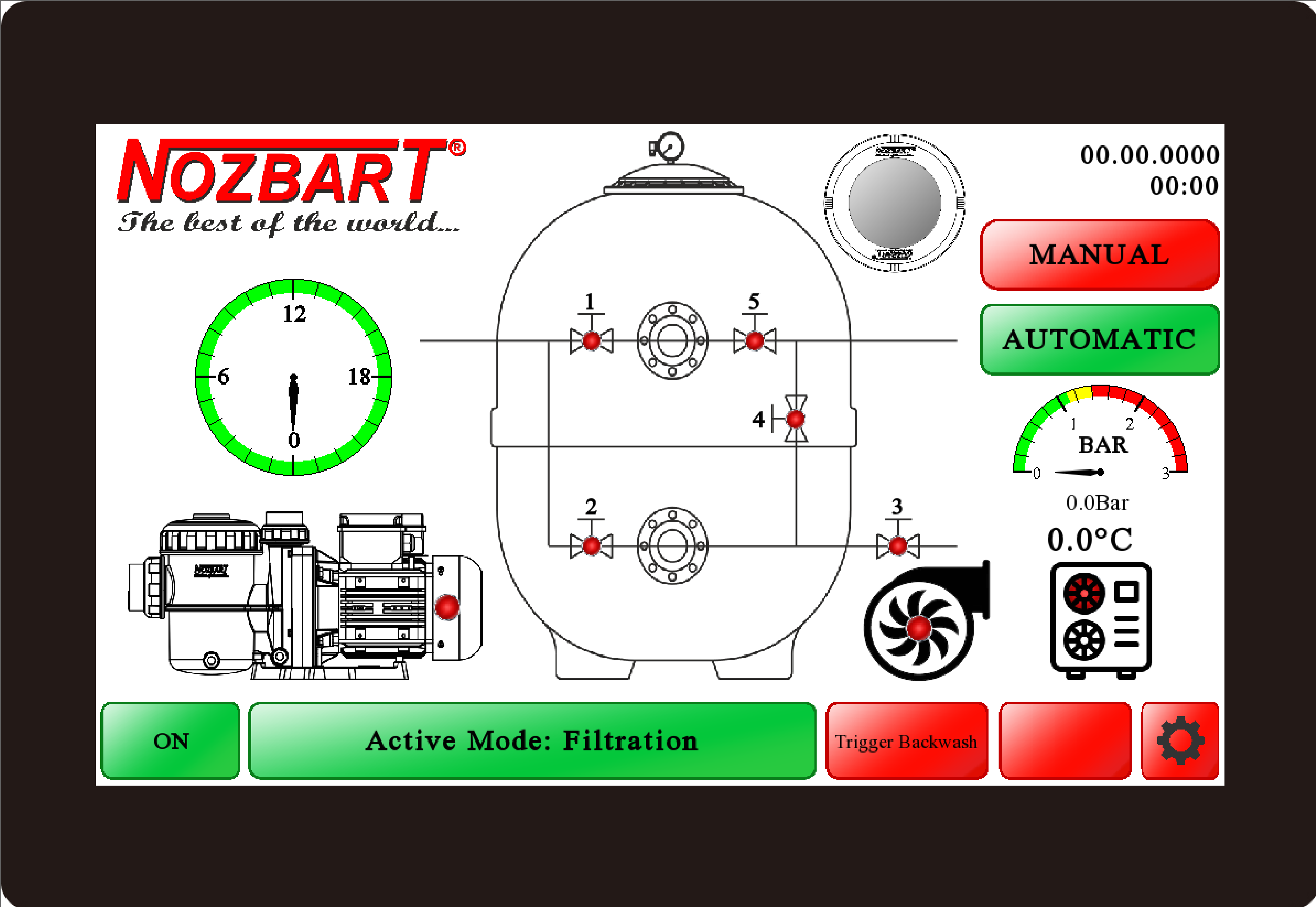 NOZBART® NOZAK Akıllı Otomasyon Sistemi; havuz ve filtrasyon sistemlerinde maksimum güvenlik, otomasyon ve kullanıcı konforu sağlamak üzere geliştirilmiş ileri seviye bir kontrol çözümüdür. Elektrik ve ekipman kaynaklı riskleri anlık olarak algılayarak sistemi koruma altına alır, operasyonun güvenli ve kesintisiz şekilde devam etmesini sağlar.