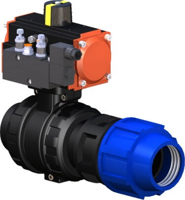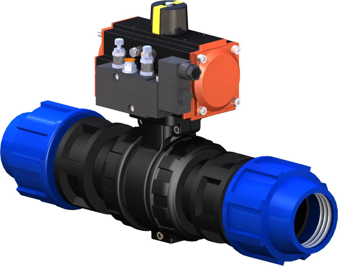 NOZBART® HDPE Rakorlu Çift Etkili Pnömatik Aktüatörlü Çift Taraf Rakorlu PPRC Küresel Vanalar